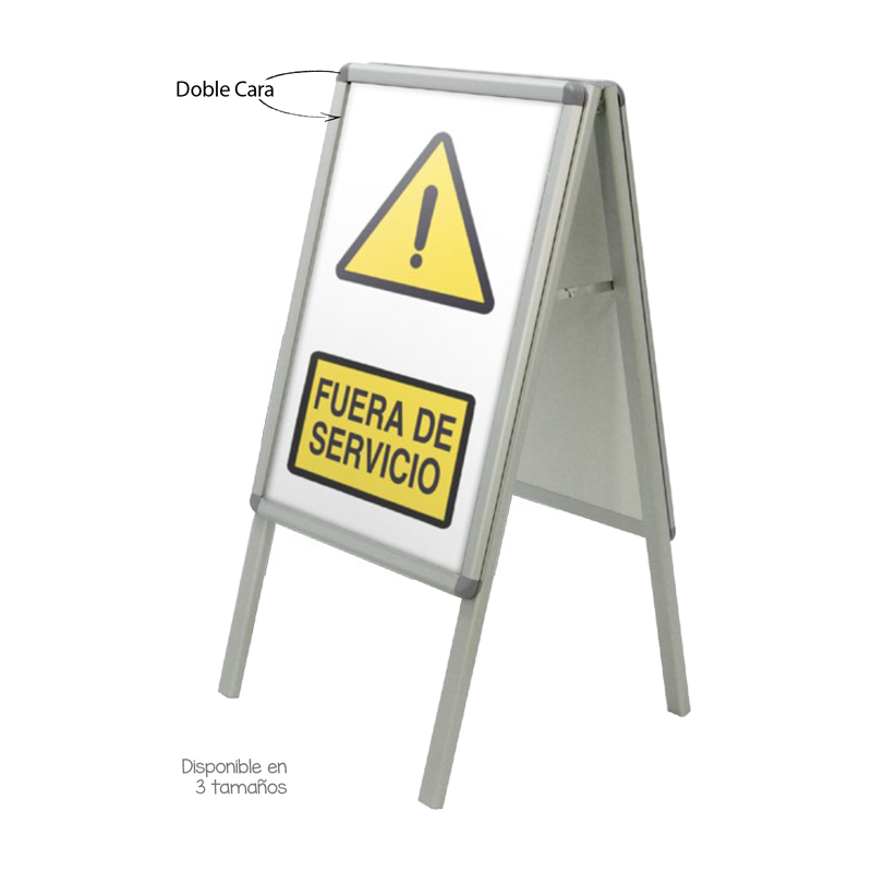 Marcos sobre caballete, fabricados en aluminio anodizado con moldura extrusionada de gran resistencia. Incluye plástico antirreflectante para una mejor conservación de la gráfica. Adecuado para uso interior o exterior. Fácil intercambio de gráfica gracias a su sistema de apertura “click”.