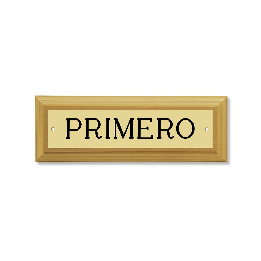 Nuestro letrero para piso con base de madera de 16 mm de grosor en color roble AG-11 está fabricado en latón o en aluminio mate.