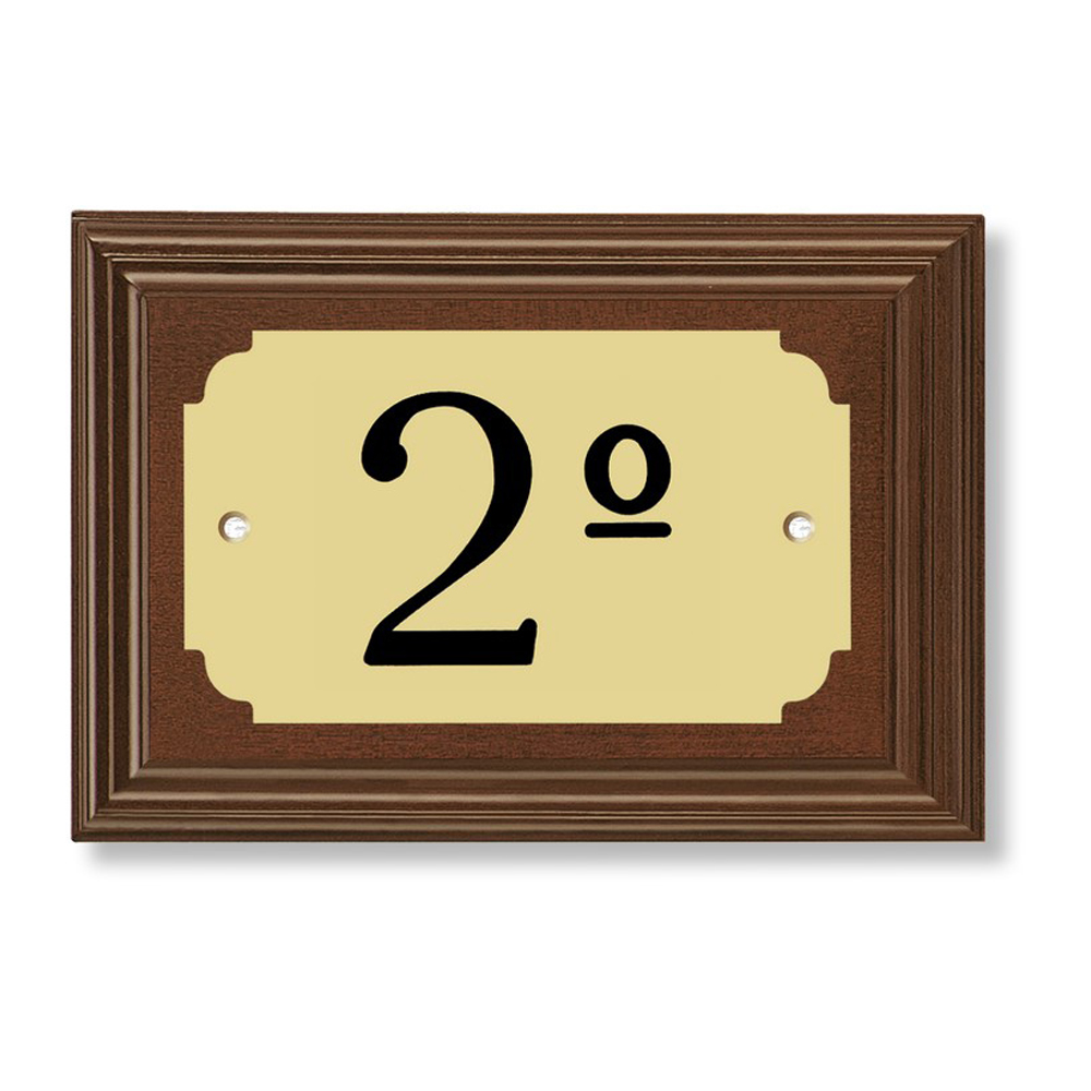 Nuestro letrero para piso con esquinas recortadas y base de madera de 16 mm de grosor en color cerezo AG-22 está fabricado en latón o en aluminio mate.