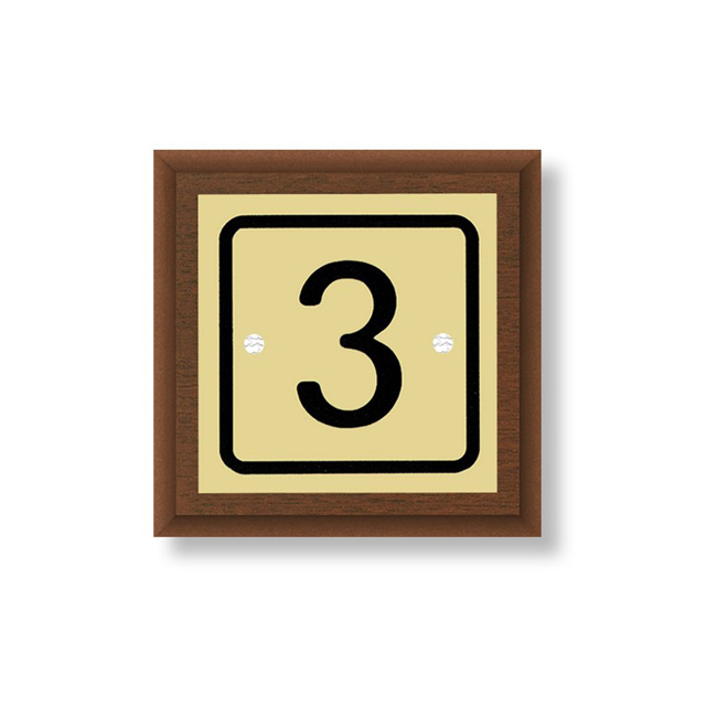 Nuestro letrero para piso con orla y base de madera de 11 mm de grosor en color cerezo AG-64 está fabricado en latón o en aluminio mate.