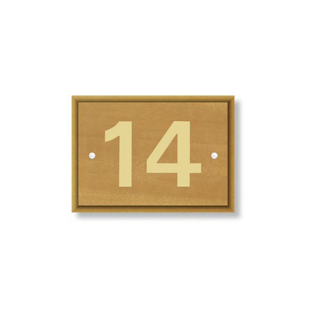 Nuestro letrero para piso de madera de 11 mm de grosor en color roble AJ-34 con letras o números adhesivos de latón identifica cada planta o puerta de un edificio mediante el texto indicado en él.
