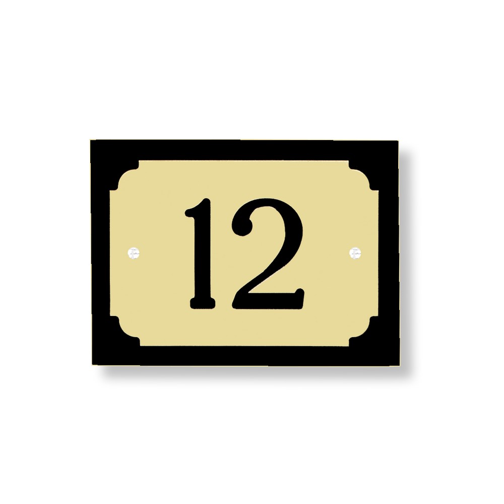 Nuestro letrero para piso con esquinas recortadas y base de poliestireno negro AF-25 está fabricado en latón o en aluminio mate.