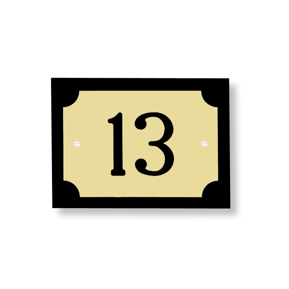 Nuestro letrero para piso con esquinas recortadas y base de poliestireno negro AF-35 está fabricado en latón o en aluminio mate.