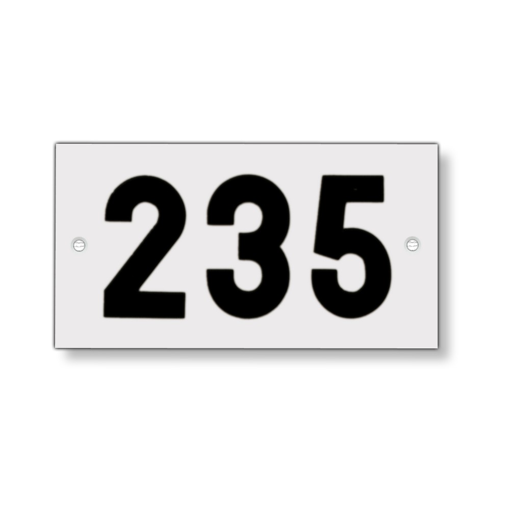 Nuestra placa con letras o números adhesivos está fabricada en poliestireno blanco con letras o números de metacrilato negro.