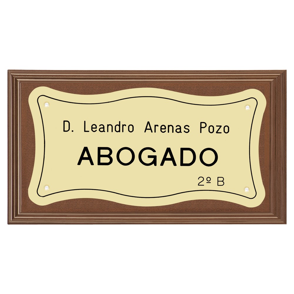 Nuestras placas de diseño para profesionales y negocios con base de madera están fabricadas en latón o aluminio mate. La base de madera tiene un grosor de 16 mm y es de color cerezo.