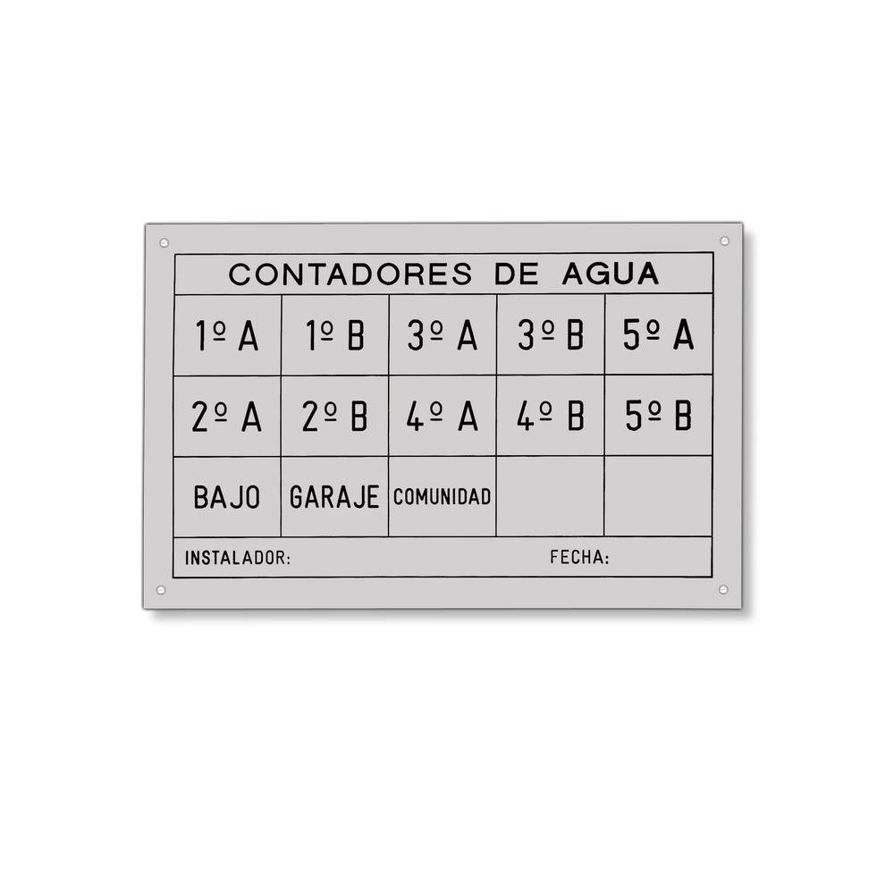Puedes hacerte con tu placa para contadores personalizada AD-15, la cual indica la situación de los contadores correspondientes a cada vivienda gracias a las inscripciones realizadas en estas placas. De esta manera es fácil identificar a quién corresponde cada contador cuando se realiza la lectura del consumo de agua.
